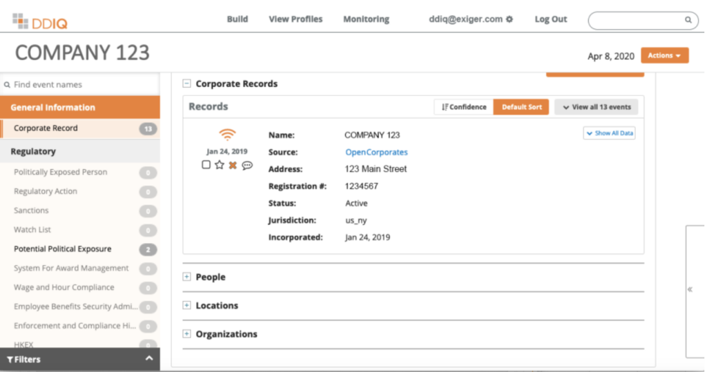 Exiger chose OpenCorporates as one of the first data sources to connect to DDIQ via our API service. This allows DDIQ to call on our data whenever a user searches for the name of a person or company they want to conduct due diligence on.